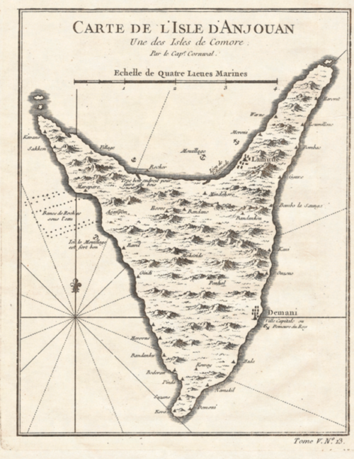 There is also 1748 map done by Frenchman Jacque-Nicolas Bellin of the island of Joanna with the names "Comore" and "Meroni" on it.