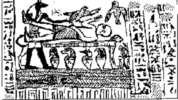 Since Facsimile 1 appears to be a fairly typical scene from Egyptian funerary texts, it is noted that other similar Egyptian motifs do not show the priest holding a knife. A proposed restoration of Facsimile 1 by Egyptologist Lanny Bell, for example, shows the priest holding a cup in his hand over the figure on the lion couch.