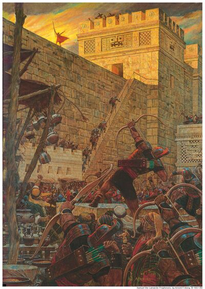 Vejam este famoso quadro.... Aqui está Samuel, o Lamanita, em uma muralha nefita. Existem Muralhas como esta, descritas no Livro de Mórmon? Não. Você apenas vê coisas simples, e eram consideradas uma grande inovação tecnológica nos tempos de Morôni, onde eles cavavam uma trincheira, cobriam com lama e colocavam uma paliçada de troncos ao redor do seu topo. É isso. Era uma tecnologia muito baixa. Não há nada como nesta gravura. Esta muralha é como Cuzco, ou algo assim. Mas isso foi centenas de anos depois da história do Livro de Mórmon e provavelmente longe de toda a área descrita no Livro, e, como você sabe e já me ouviu dizer antes, depois que Samuel pulou desta Muralha Nefita, não se ouviu mais sobre ele. A razão mais óbvia é que....ele morre. Ele não poderia sobreviver a este salto. Mas, de novo, você baseia seu entendimento do Livro de Mórmon a partir desta imagem? Ou você o baseia no que o Livro realmente diz?[11]