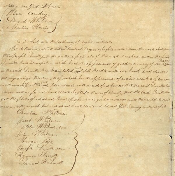 E quando estou distante no caminho da convicção, e oito homens, sejam eles literados ou o que seja, vem à minha presença e afirmam que eles também viram as placas; e não apenas viram, mas as "manusearam", estou convencido. Não poderia sentir-me mais satisfeito e em paz caso a família Whitmer inteira houvesse testificado.[164]